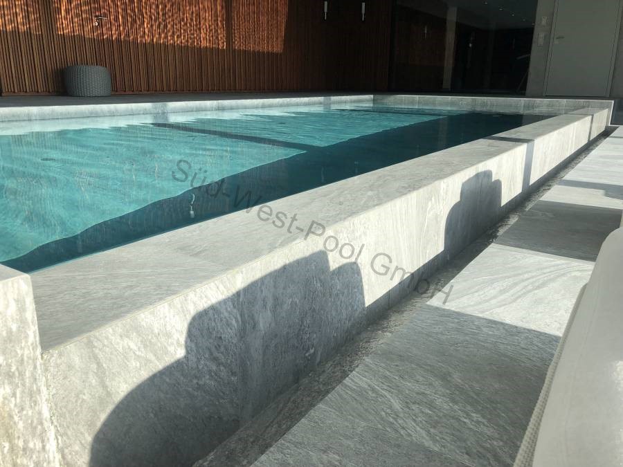 Betonbecken mit einseitiger Überlaufrinne und Fließen,Unterflur-Rollladenabdeckung,